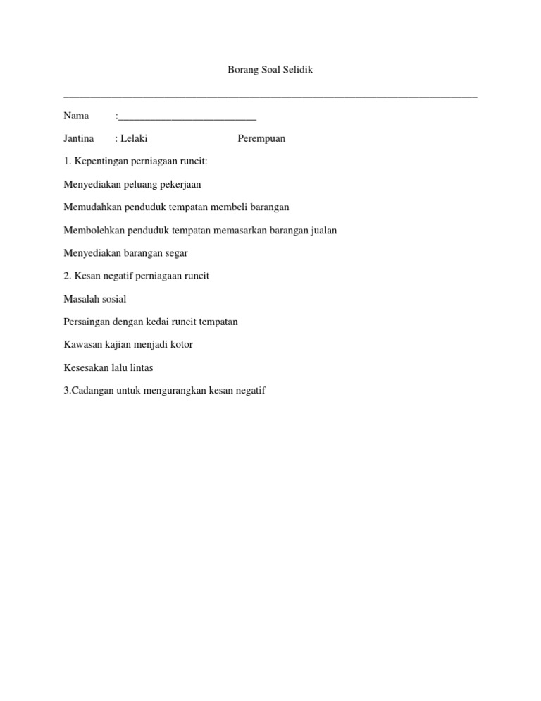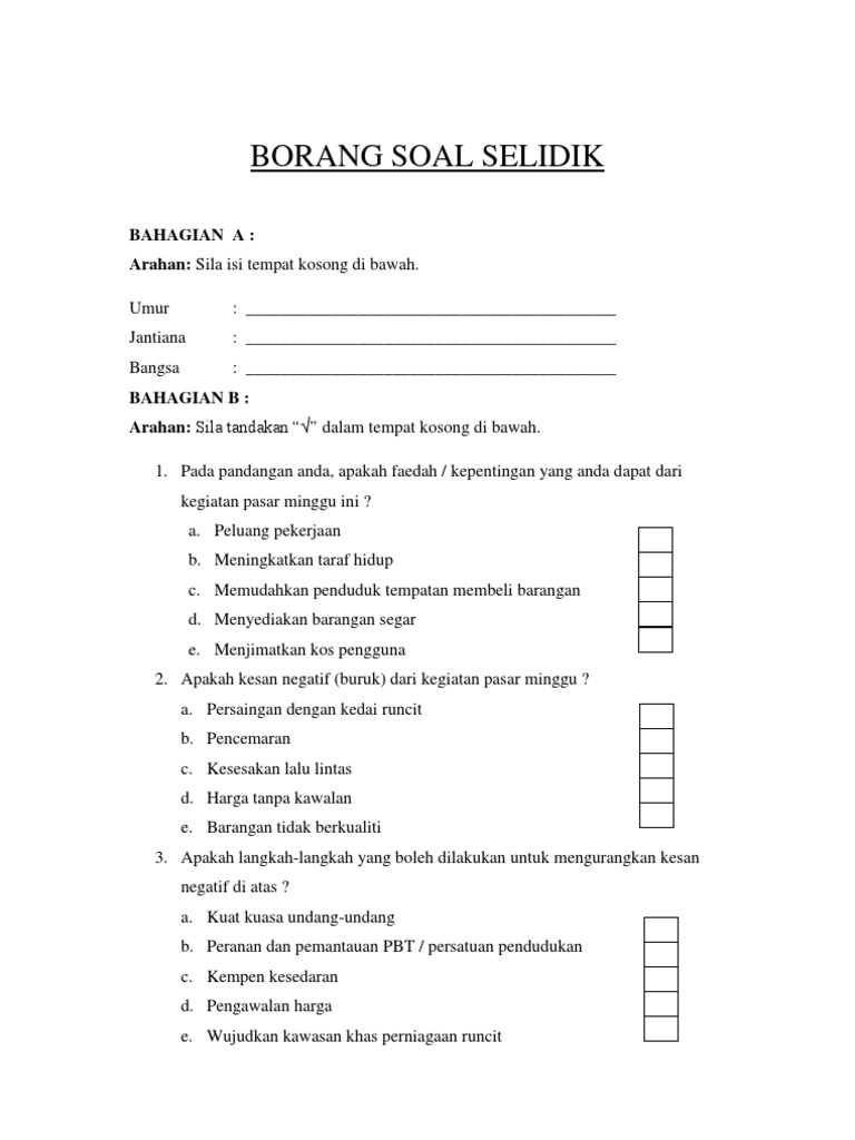 Mohon bantuan beliau untuk melengkapkan soal selidik di bawah. SOAL SELIDIKSoal selidik merupakan satu set soalan atau item dalam bentuk tulisan. Muat Turun 23-08-2019 19605 KB.