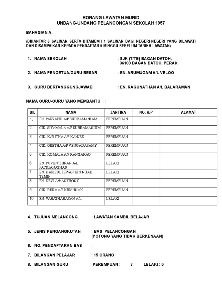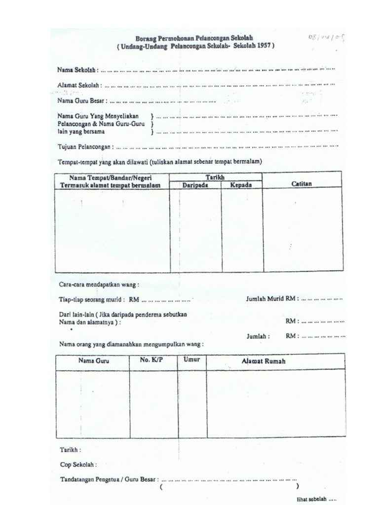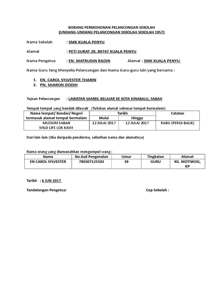 Nama guru yang menyelia pelanconganEN MOHAMAD ASRI B ISHAK. PERATURAN-PERATURAN PELANCONGAN SEKOLAH 1957 Borang-borang permohonan untuk perkara di atas hendaklah dibuat dalam 5 salinan ditambah 2 salinan bagi tiap-tiap negeri yang hendak dilawati atau dilalui dan disampaikan ke Pejabat Pelajaran Daerah 5 minggu dalam Negeri dan 5 minggu luar Negara sebelum tarikh pelancongan. Details borang permohonan pembangunan islam barupdf.