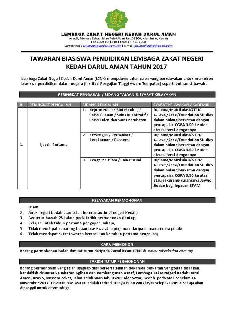 Muat turun syarat-syarat dan mohon melalui. LEMBAGA ZAKAT NEGERI KEDAH DARUL AMAN MENARA ZAKAT JALAN TELOK WAN JAH 05200 ALOR SETAR KEDAH DARUL AMAN. 04-7316280 Laman web.