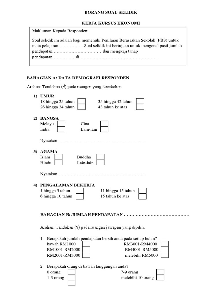 Check Pages 1 - 6 of BORANG SOAL SELIDIK in the flip PDF version. Sebagai contoh jika soal selidik diberikan kepada wanita isi rumah untuk memahami perbelanjaan ke arah pendapatan isi rumah senarai soalan yang sangat berstruktur boleh menghadkan pengumpulan data. PANDUAN MENJAWAB BORANG SOAL SELIDIK MURID 1.