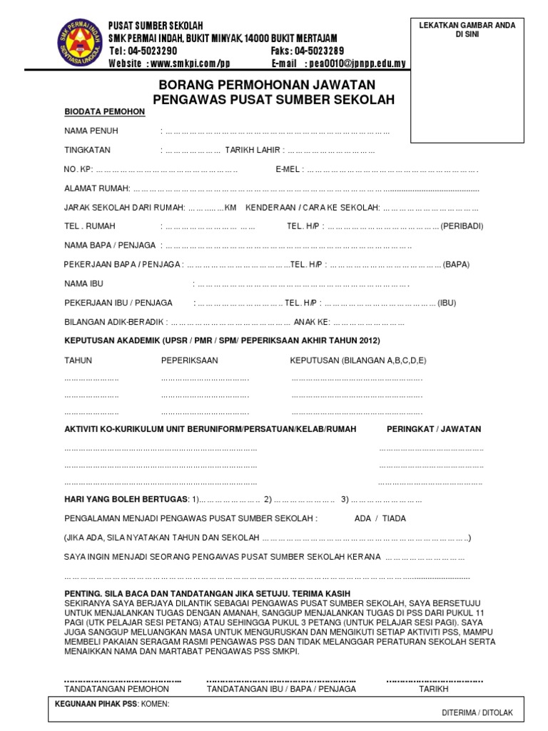 Borang Permohonan Jawatan Pengawas Pss Smkpi Docx