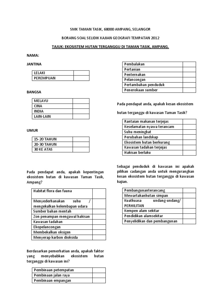 9302020 Berikut dikongsikan contoh borang soal selidik geografi pt3 2018 yang boleh dijadikan panduan dan rujukan buat pelajar dalam menyiapkan kerja kursus folio geografi pt3 2018. BORANG SOAL SELIDIK KAJIAN KEPUASAN PELANGGAN PEJABAT SETIAUSAHA KERAJAAN NEGERI SEMBILAN DARUL KHUSUS TAHUN 2013 A. BORANG SOAL SELIDIK Kajian ini adalah satu kajian ilmiah untuk menyiapkan Disertasi Sarjana dalam bidang Pengajian Usuluddin di Universiti Malaya Kuala Lumpur.