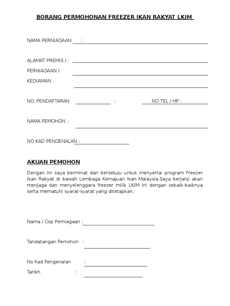 Borang lkim1. Permohonan adalah secara online melalui portal online atau borang yang telah ditetapkan di Lembaga Kemajuan Ikan Malaysia LKIM Permohonan hendaklah sampai kepada pihak mereka sebelumpada tarikh tutup. 12192014 Permohonan hendaklah dibuat dengan menggunakan Borang LKIM1 yang boleh didapati di Seksyen Pengurusan Sumber Manusia Aras 3 Wisma Lembaga Kemajuan Ikan Malaysia Jalan Desaria Pulau Meranti 47120 Puchong. Bahagian Khidmat Pengurusan LKIM.