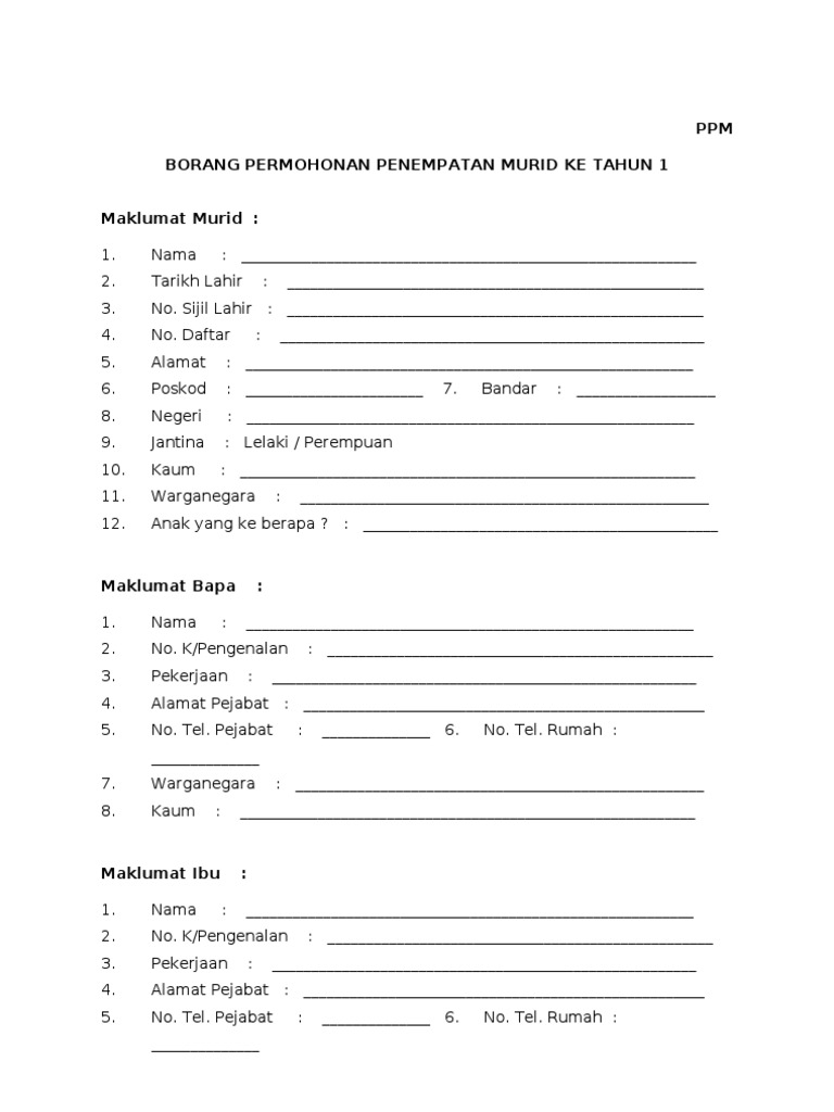 2282021 Klik pada Tahun 1 untuk mendaftar anak anda ke sekolah rendah. Daftar pelajar baru dan serahkan borang pendaftaran pelajar baru kepada Jawatankuasa Pendaftaran untuk di daftarkan. BORANG PPM BORANG PERMOHONAN PENEMPATAN MURID KE TAHUN 1 BIL.
