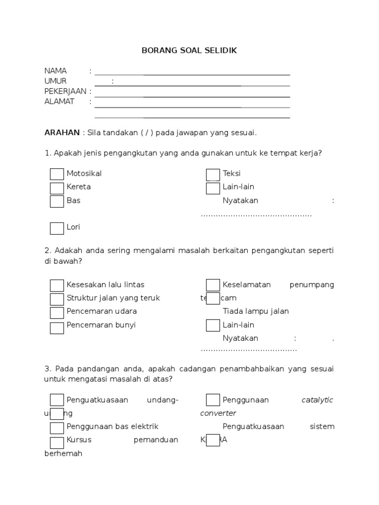 Borang Soal Selidik Pengangkutan Tugasan Geografi Pt3 2016. Semoga perkongsian bahan-bahan rujukan panduan bahan pembelajaran dan pengajaran contoh-contoh karangan sumber rujukan PT3 Pentaksiran Tingkatan 3 tingkatan 1 tingkatan 2 tingkatan 3 dalam post di blog Bumi Gemilang berguna dan dapat membantu para pelajar dan. Soal Selidik Docx Kerja Lapangan Geografi Tingkatan 2 2019 Borang Soal Selidik A Maklumat Diri Responden Nama Jantina Lelaki Bangsa Perempuan Melayu Course Hero.