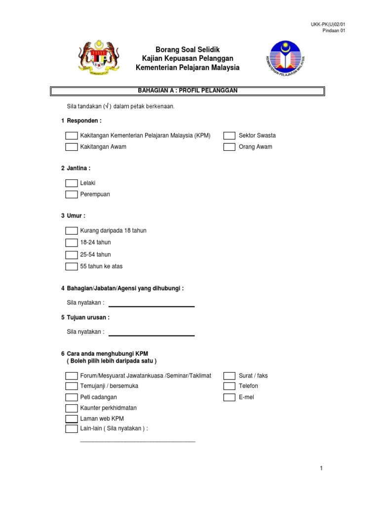 Bagi maklumbalas dan cadangankomen yang telah disempurnakan ke Bahagian ini melalui salah satu Serahan borang. Https Www Moe Gov My Muat Turun Borang 59 Borang Soal Selidik Kajian Kepuasan Pelanggan File For more information and source see on this link. Kakitangan Kerajaan Badan Berkanun b.