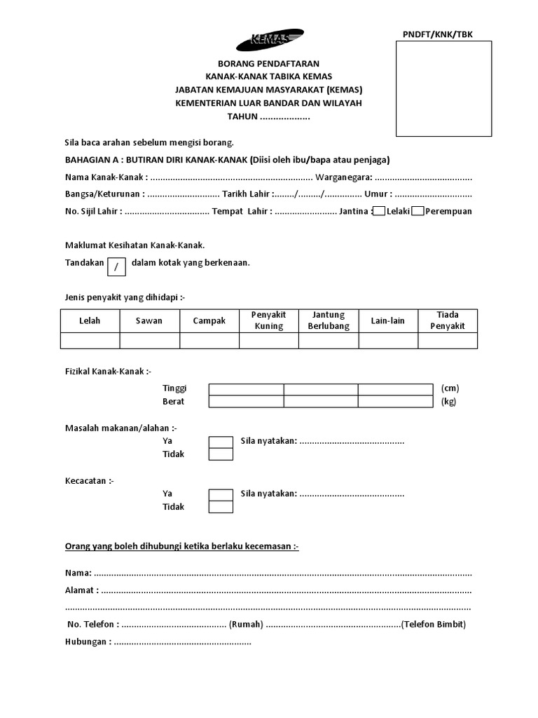 Borang Permohonan Pendaftaran Tabika Kemas. Permohonan dan Syarat kemasukan ke Taska dan Tadika KemasTadika Kerajaan 20202021 Jabatan Kemajuan Masyarakat melalui KEMAS memperlawa IbuBapaPenjaga yang mempunyai anak kecil yang berumur 2 tahun hingga 4TASKA tahun dan 4 tahun hingga 6 tahunTADIKA untuk membuat permohonan. Sila baca arahan sebelum mengisi borang BAHAGIAN A.
