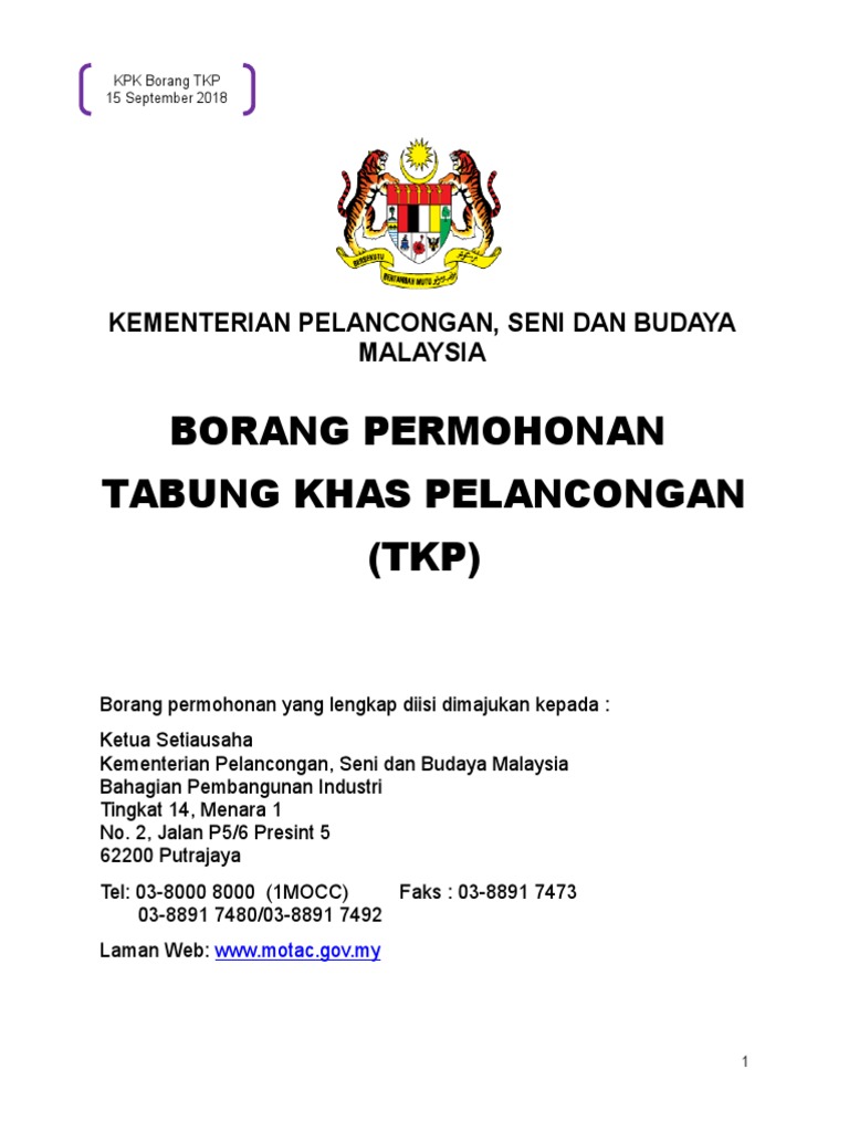 Borang kementerian pelancongan. Permohonan Jawatan Kosong di Kementerian Pelancongan Seni Dan Budaya Malaysia MOTAC dialukan memohon dan mempelawa kepada Warganegara Malaysia yang berkelayakan dan berumur tidak kurang dari 18 tahun pada tarikh tutup iklan jawatan untuk mengisi kekosongan jawatan tetap kontrak seperti berikut -. Sebarang tuntutan ganti rugipampasan perlu dituntut melalui Tribunal Tuntutan Pengguna Malaysia. UBAH AHLI LEMBAGA PENGARAH 1.