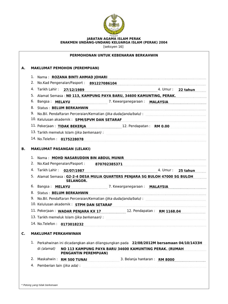 Contoh Borang Nikah Perak. Rujuk Orang Islam Negeri Kelantan di mana saya. Borang permohonan kebenaran berkahwin aku dah ambil minggu lepas di Pejabat Agama Islam Daerah Hulu Langat.