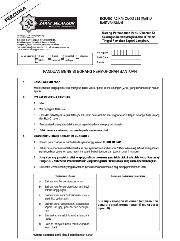 Borang Permohonan Agihan Za Borang Bantuan Umum Pdfa A Bangunan Zakat Selangor 3 01 1 Borang Permohonan Agihan Zakat P Ercum A Sebab Memohon Bantuan 1 Syarat Umum Permohonan